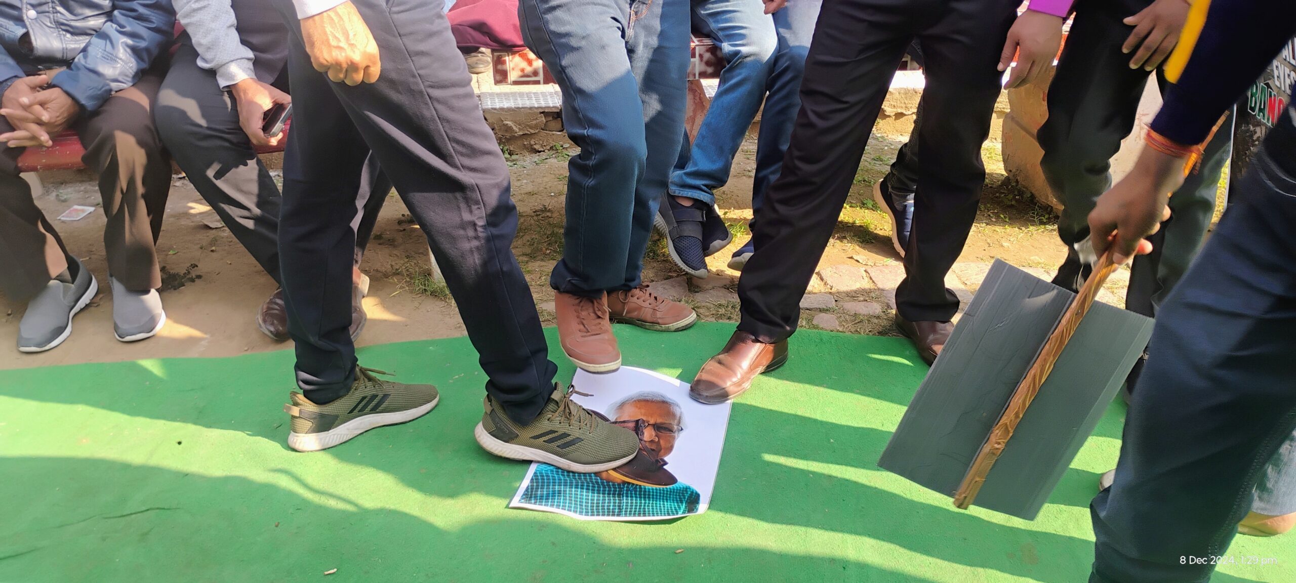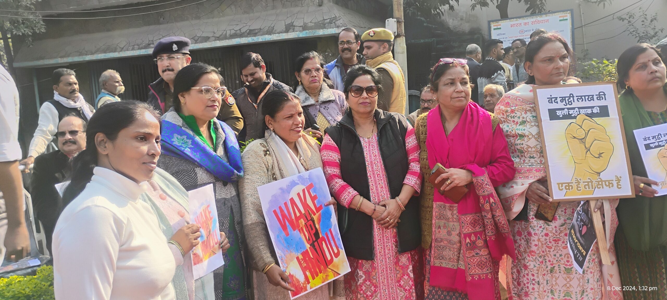 तख्तियों पर बांग्लादेश में हिंदू छात्रों महिलाओं मंदिरों संतो के विरुद्ध हो रहे अत्याचारों के स्लोगन लिखे हुए थे।